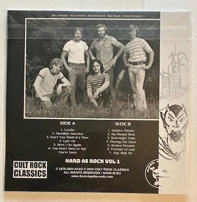 Brand new limited edition vinyl LP from the US (from Deer Creek, IL.) `70s hard rock/heavy metal band AXAS - BROKEN DREAMS - from Cult Metal Classics/Sonic Age Records in Greece. Includes their debut 1975 7" single, their 1979 LP and two previously unreleased bonus tracks. One of only 150 Orange/Yellow swirl color vinyl LPs done and comes with an OBI strip hand-numbered and an insert sheet with lyrics and l.iner notes. New mint and unplayed and comes in a resealable plastic sleeve.