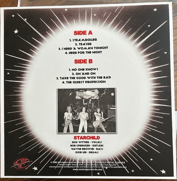 New Import LP of the Canadian hard rock/metal band from the `70s and early `80s - STARCHILD - STEAMROLLER - from Cult Metal Classics from 2024. Legendary hard rockers who had their debut out in 1978 on Axe Records. This album collects their 3 1982 demos, plus additional unreleased material from the early 80s before they split up. Limited Edition White vinyl with red and black splatters and 1 of only 110 copies done. New, unplayed copy in a resealable plastic sleeve with a hype sticker on the front.