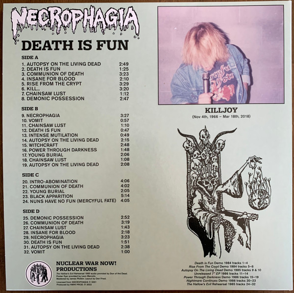 Rare 2 LP collection of the 1980s demos from pioneering Death Metal band NECROPHAGIA - DEATH IS FUN - from 2022 from Nuclear War Now! Productions. Includes their demos from 1984, 1985 and 1986, as well as some rehearsals from 1985. Also includes a cover of MERCYFUL FATE's "Nuns Have No Fun" track. Sold out/out of print now from the label and tough to find.