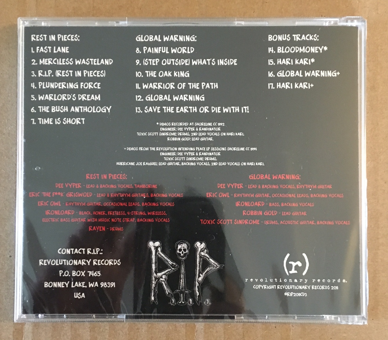 Expanded double reissue of the 1991 Rest In Pieces EP and the 1992 Global Warning EP by Seattle, WA's Godfathers of Theatrical Shock-Rock Environ-Metal, R.I.P. These ultra rare EPs are taken from the original master tapes, and include 4 bonus songs (previously unreleased anywhere else). Hear the band that The Rocket Newspapers called "...one of the biggest and most important cult movements in local music.", who started the whole "Environ-Metal" phenomenon. Slightly punk tinged Power-Metal tunes, and an incredible stage show influenced by Alice Cooper, Kiss, Gwar, Green Jello and others. Includes the original jacket artwork from both EPs blended together into a 6-page insert complete with rare photos, lyrics, special thanks and credits including lyrics and details on the unheard bonus tracks.