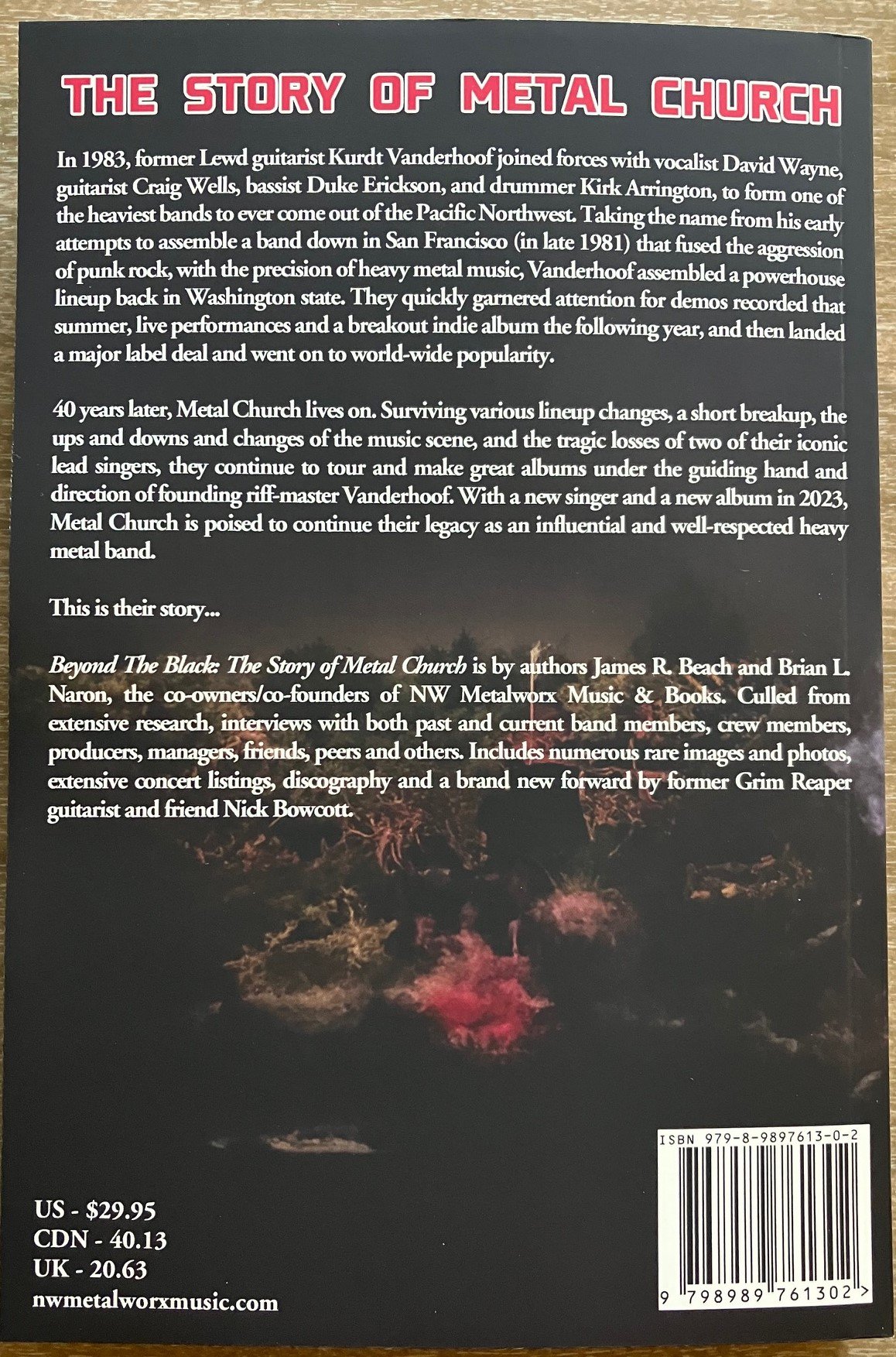 BEYOND THE BLACK: THE STORY OF METAL CHURCH is a new book from NW Metalworx Books by author James R. Beach and co-author and archivist Brian L. Naron. Culled from extensive research, interviews with both past and current band members, crew members, producers, managers, friends, peers and others. Includes numerous rare images and photos, extensive concert listings, discography and a brand new forward by former Grim Reaper guitarist and friend Nick Bowcott.