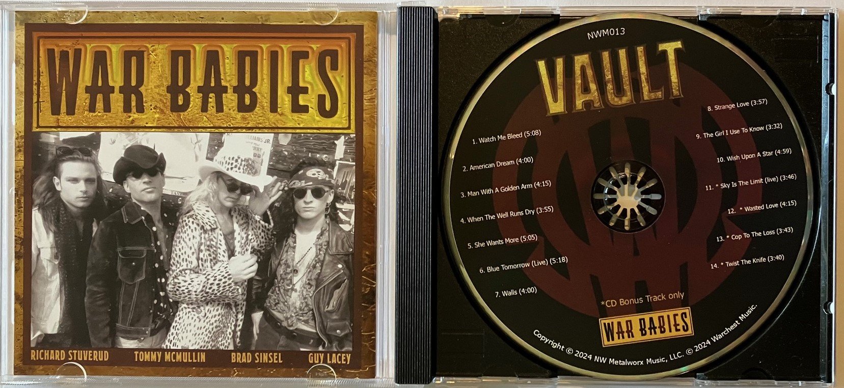 New limited edition CD from Seattle's WAR BABIES - VAULT - from NW Metalworx Music from 2024. Comprised of unreleased recordings from a London Bridge session in May of 1990 (featuring Pearl Jam/Mother Love Bone/Green River bassist Jeff Ament), A & M Studios in 1991, and a couple of live recordings from 1992. Features members of TKO, Slaughter Haus 5, Suicide Squad, Sledgeback, Fastbacks, etc. CD includes 4 additional bonus tracks not on the LP version. Sealed new CD in plastic/shrinkwrap.