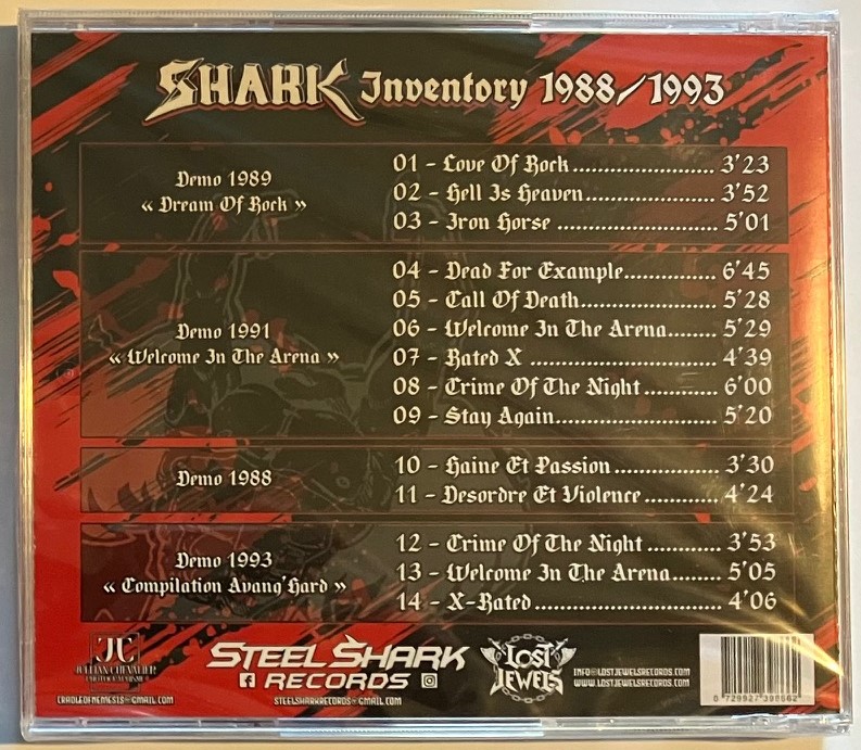 New Import CD from French Heavy Metal band SHARK - INVENTORY 1988/1993 - from Lost Jewels and Steel Shark Records from 2025. Includes their demos from 1988, 1989, 1991 and 1993 and newly remastered. Brand new copy sealed in shrinkwrap/plastic.