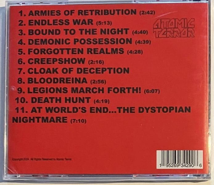 Brand new full-length CD album from newer Portland, Oregon Thrash Metal band ATOMIC TERROR - ENDLESS WAR - from 2024. Old school thrash in the vein of Kreator, Slayer, Exodus, early Metallica, etc. New sealed copy in shrinkwrap/plastic and comes with a bonus sticker (one of two pictured).