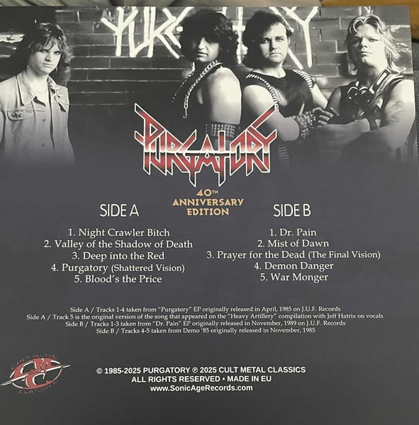 Brand new 40th Anniversary reissue of the Self-Titled Debut album by PURGATORY - from 2025 from Cult Metal Classics in Greece. Black vinyl LP variant.